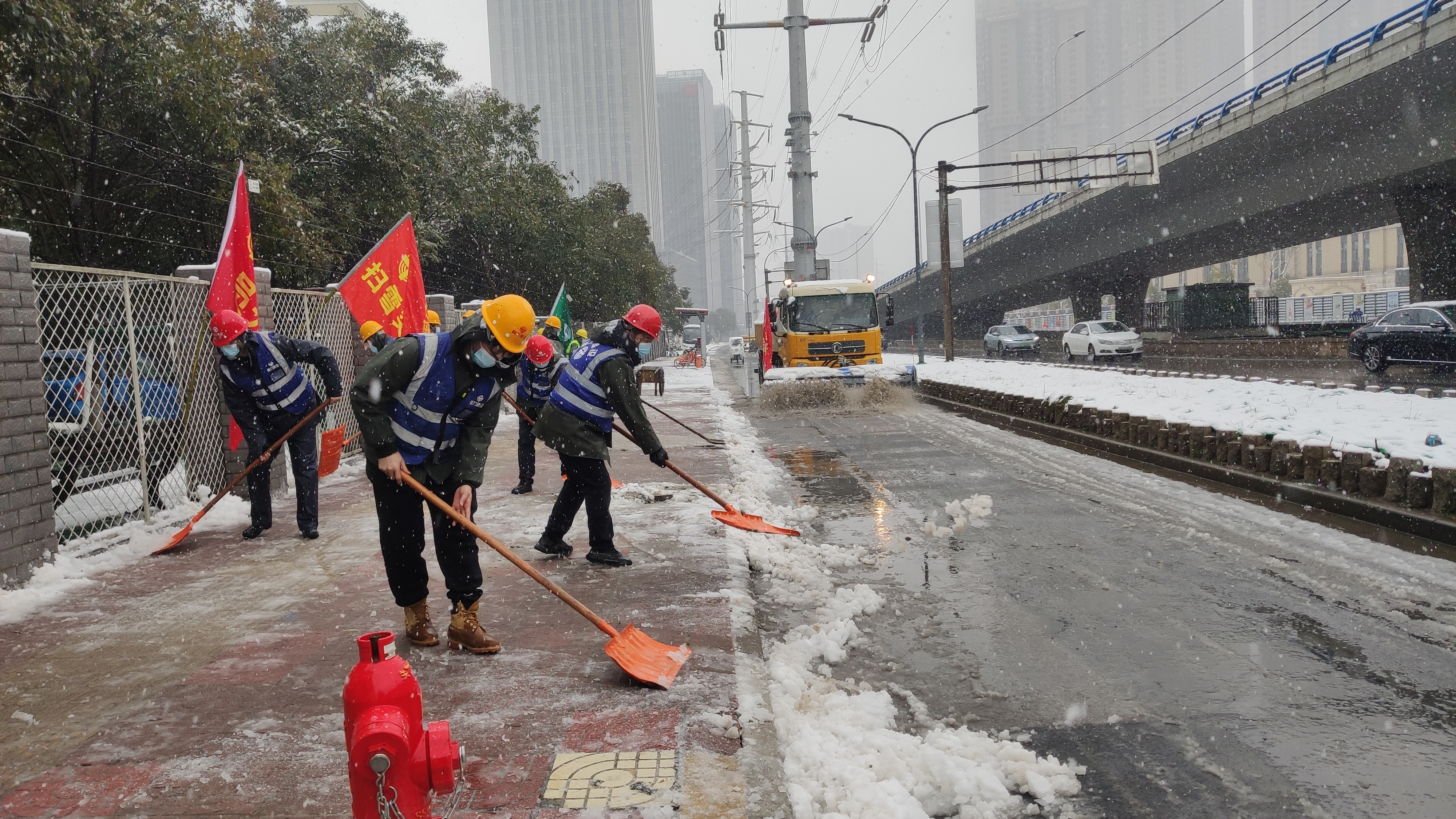一場(chǎng)大雪,使得江心洲道路積雪難行,江心洲項(xiàng)目部用最快的速度清理道路積雪,以實(shí)際行動(dòng)保障道路暢通,忙碌的身影給漫天大雪增添了一道文明亮麗的風(fēng)景。